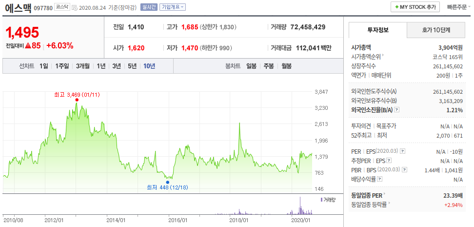 에스맥의 자회사인 다이노나가 혈장에서 코로나 바이러스를 차단하는 항체 추출 기술을 가지고 있어 관련주로 부각되고 있습니다.
