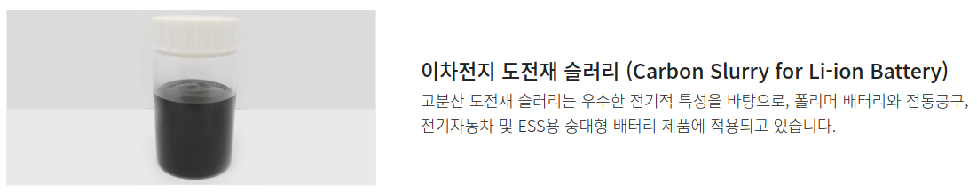 '2014년 이차전지 도전재 슬러리 개발을 시작하여, 독자적인 바인더 용해 기술과 최적화된 도전재 분산기술을 바탕으로 고출력/고용량 전지에 적합한 특성을 확보하였으며, 2017년 HEV용(하이브리드) 도전재 슬러리를 양산화하여 2018년 LVS용(저전압 시스템), PHEV용(플러그인 하이브리드), EV용(전기차) 제품을 확대 공급하고 있습니다. 현재는 차세대 CNT 도전재, 실리콘 음극재 개발 및 국내/해외 시장개척에 힘쓰고 있습니다.' - 동진쎄미켐 홈페이지 신재생에너지 중