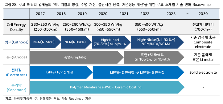 이를 충족시키기 위해 양극재는 기존 NCM(니켈, 코발트, 망간)에서 니켈 함량을 점점 늘려갔으며 AI(알루미늄)을 첨가하며 하이니켈 NCM, 하이니켈 NCA로 변화했습니다. 최근에는 주행거리를 늘리기 위해 기존의 하이니켈 NCM 양극재에 AI(알루미늄)을 첨가해 NCMA(니켈, 코발트, 망간, 알루미늄) 양극재를 만들어가고 있으며 하이니켈 양극활 물질과 CNT(Carbon nanotube) 도전재를 적용해 에너지 밀도를 높여가고 있습니다.