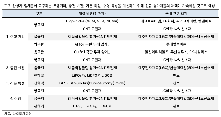 현재 완성차 업체들의 배터리 성능 요구사항은 명황학 상태이며 배터리 업체들은 이에 집중하고 있는 모습입니다. 주행거리, 충전시간, 배터리 수명, 배터리 단가, 저온 특성까지 5가지가 중심입니다.