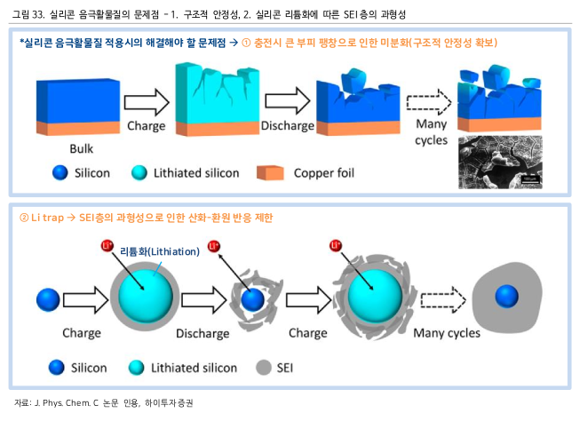 그렇다면 이렇게나 좋은 실리콘을 왜 다량 함유해서 사용하지 않는 것일까요? 실리콘(Si)은 흑연과 달리 충전될 때 과도한 팽창을 하게 되어 SEI(보호층) 층을 부수는데, 이는 배터리 수명을 단축시키는 문제를 일으킵니다. 또한 양극재 발전의 단계, 기술의 한계, 효율 등의 이유로 현재는 소량 혼합하거나 복합체를 형성하여 100% 흑연보다 약간 높은 에너지 용량을 구현하는 수준으로 사용되고 있습니다.