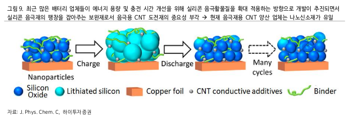 효율이 좋지만 문제가 있는 실리콘을 보완해주는 것이 바로 CNT도전재입니다. CNT(Carbon Nano Tube)는 탄소나노튜브로 흑연계 연필 가루처럼 생겼으며 활물질을 더욱 활성화시키는 역할을 합니다. 동진쎄미켐이 노스볼트에 공급하는 음극재 CNT도전재의 경우 실리콘(Si) 팽창(효율, 수명 감소)을 잡아주는 보완재 역할을 합니다.