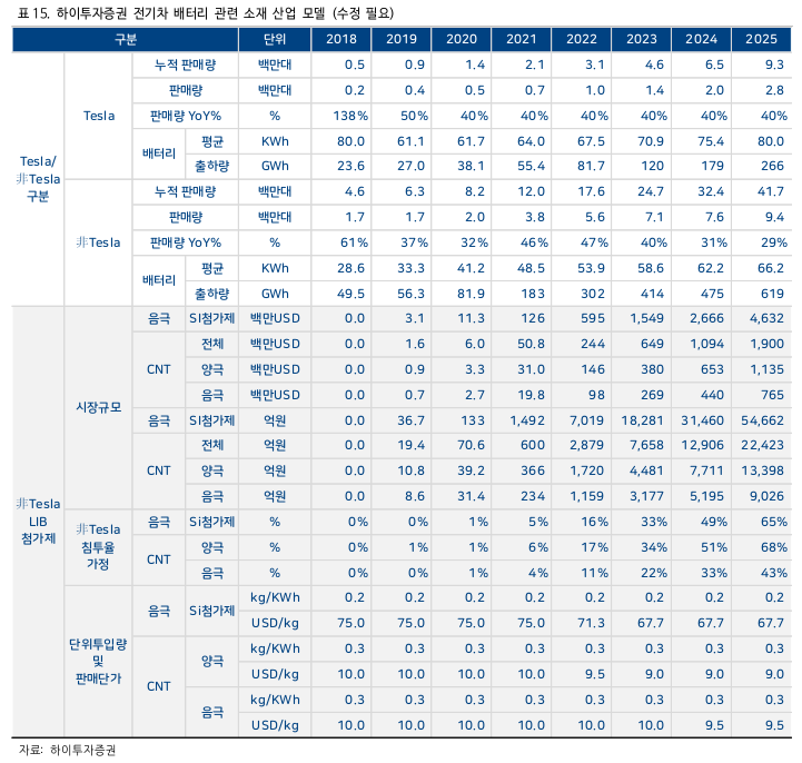 CNT도전재 시장규모는 2020년 현재 600만 달러(약 70억 원) 규모로 추정되고 있으며 2025년 19억 달러(약 2조 2,500억 원)로 성장할 것으로 전망하고 있습니다. 이 수치는 테슬라를 제외한 업체를 기준으로 하였으며 하이투자증권 연구원들에 따르면 보수적으로 접근한 수치라고 합니다. 따라서 더 큰 시장규모의 가능성도 열려있다고 볼 수 있습니다.