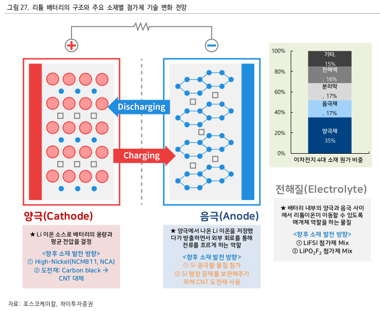 그렇다면 음극재와 CNT도전재가 무엇이길래 이러한 평가를 받는가 알아볼 필요가 있습니다. 최근 하이투자증권에서 '3가지 마법의 가루(첨가제) - 정원석, 원민석'이라는 제목의 엄청난 리포트가 하나 나왔습니다. 음극재, CNT도전재에 관한 내용을 담고 있는데 쪽수만 무려 123페이지입니다. 기술적인 내용은 어려운 부분이라 리포트 내용을 참고해서 최대한 쉽게 설명하도록 하겠습니다.