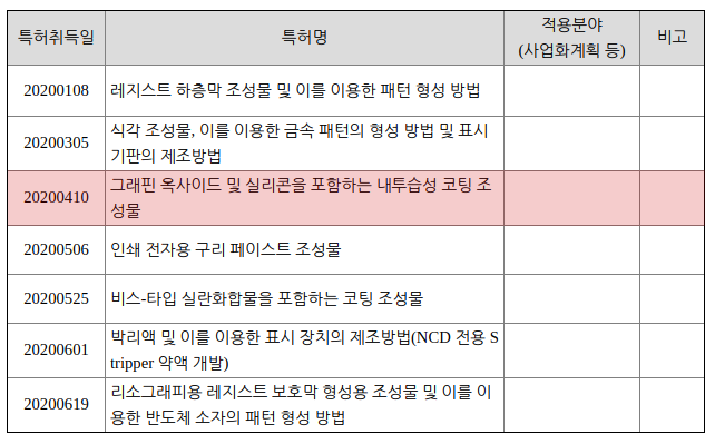 | 동진쎄미켐의 그래핀(흑연, 탄소), 실리콘 관련 특허 중 최근 등록된 혹은 등록이 진행중인 특허 리스트 | |