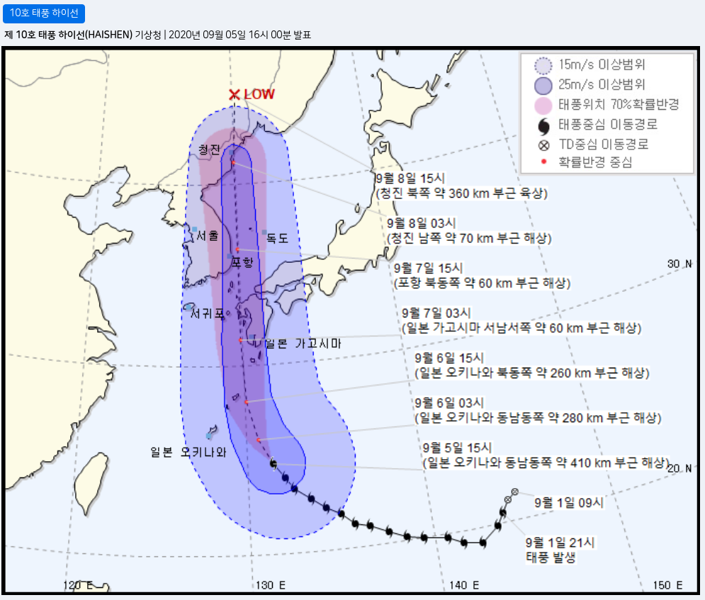 기나긴 장마가 끝나고 연일 태풍이 몰아치고 있습니다. 8월 27일 최대 풍속 24.0m/s의 제8호 '바비(BAVI)'를 시작으로 9월 3일 최대 풍속 35.0m/s의 '마이삭(MAYSAK)' 그리고 9월 5일 시작된 최대 풍속 55.0m/s 제10호 태풍 '하이선(HAISHEN)'까지 점점 강력한 태풍이 한반도로 다가오고 있습니다.