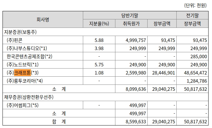 | 카카오게임즈 | 지분 보유 | 2.07% 보유 |