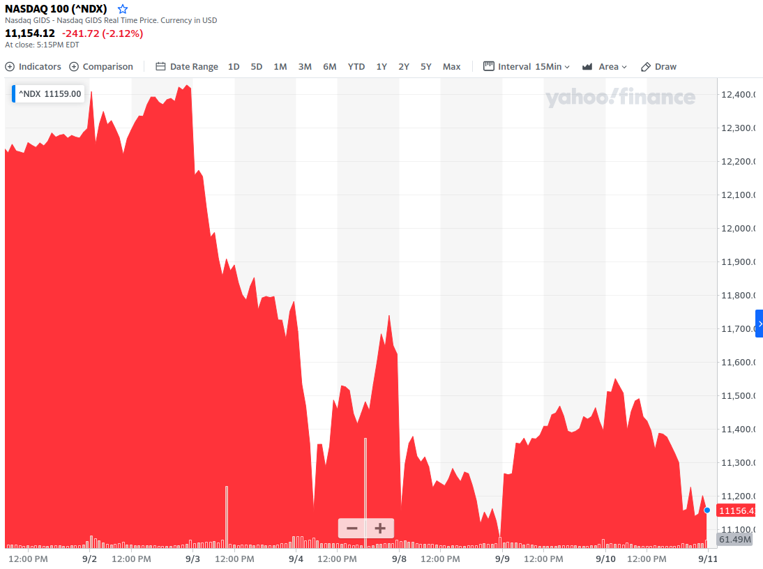 연일 신고점 랠리를 펼치던 미국 기술주 중심의 나스닥 지수가 큰 변동성을 보여주며 연일 하락하고 있습니다. 9월 2일 12,411 포인트를 찍은 나스닥 지수는 9월 11일 현재 11,300 포인트대를 보여주고 있습니다. 단기간 내에 큰 상승을 한 애플, 테슬라, 엔비디아 등이 타 기술주들에 비해 하락폭이 컸는데요. 나스닥의 급락의 배경에는 특별한 이슈가 있는 것은 아니며 개별 종목들의 이슈, 대주주들의 지분 매각, 부담스러운 밸류에이션, 소프트뱅크의 콜옵션, 단기간의 주가 급등 등의 영향으로 보입니다.