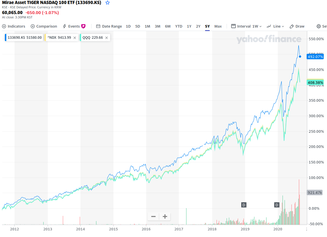개인의 소득 수준 차이, 환율의 변동 등 경우에 따라 득이 되는 ETF가 다를 수는 있으나 대체로 위와 같다고 보시면 될 것 같습니다. 지금 소개해드린 QQQ와 TIGER 미국나스닥 100 이외에도 나스닥을 추종하는 ETF는 많습니다. 국내에도 환헷지가 되는 KODEX 미국나스닥 100 선물(H)도 존재합니다.