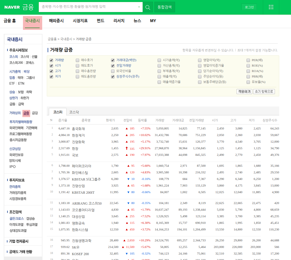 네이버 증권에서는 거래량 급증 종목도 리스트업해서 보여주고 있습니다. 급등주 리스트업과 마찬가지로 노란색 박스 안에 있는 항목을 선택하시면 데이터가 적용됩니다.