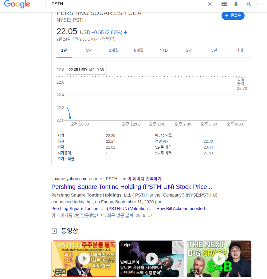 위 사진은 구글에 빌 애크먼의 스팩 'PSTH'를 검색한 결과입니다. 주가와 야후파이낸스 사이트, 유튜브 동영상 등이 눈에 들어오고 사진에는 없지만 아래쪽에 블로그에 게재된 PSTH 관련 글과 각종 언론사나 웹사이트의 뉴스를 확인할 수 있습니다.