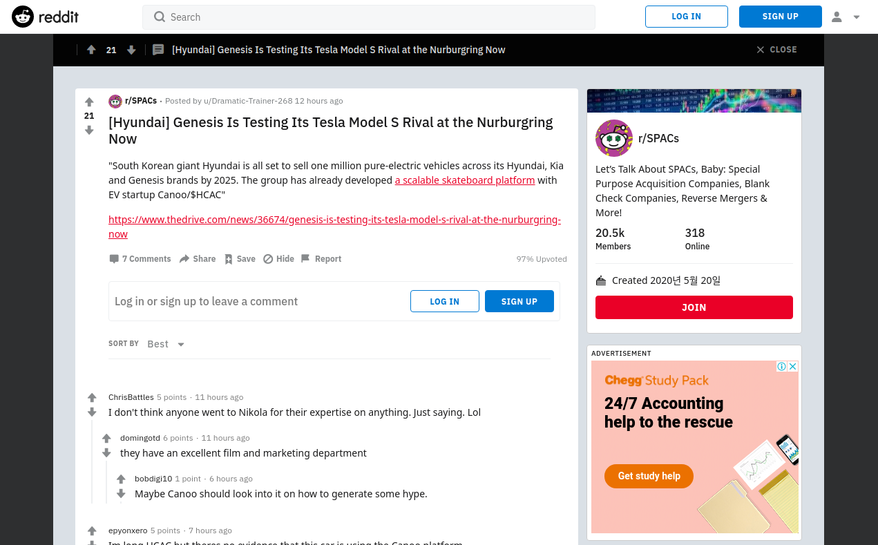 SPACs 커뮤니티에서 한국시간 9월 24일 글 중에 하나를 보시면 현다이[Hyndai], 현대에 관한 글을 보실 수 있습니다. 현대자동차가 '카누(Canoo)'라는 기업과 함께 전기차를 개발하고 있는데, 이 '카누'가 스팩을 통한 우회상장이 예정되어있어 관련 뉴스를 언급하고 있는 모습입니다. 카누와 합병할 스팩의 티커는 'HCAC'입니다.