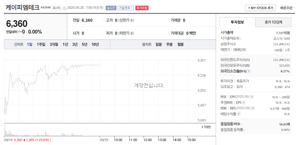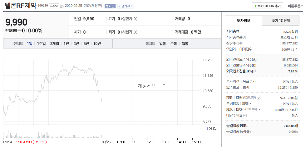 케이피엠테크와 텔콘RF제약인데요. 케이피엠테크는 9월 24일 상한가, 텔콘RF제약은 장 중 상한가 근처에 도달했다가 2.88% 상승으로 장 마감했습니다. 주목할 것은 텔콘RF제약의 경우 9월 24일 외국인 순매수 규모가 36만 주라는 점입니다.