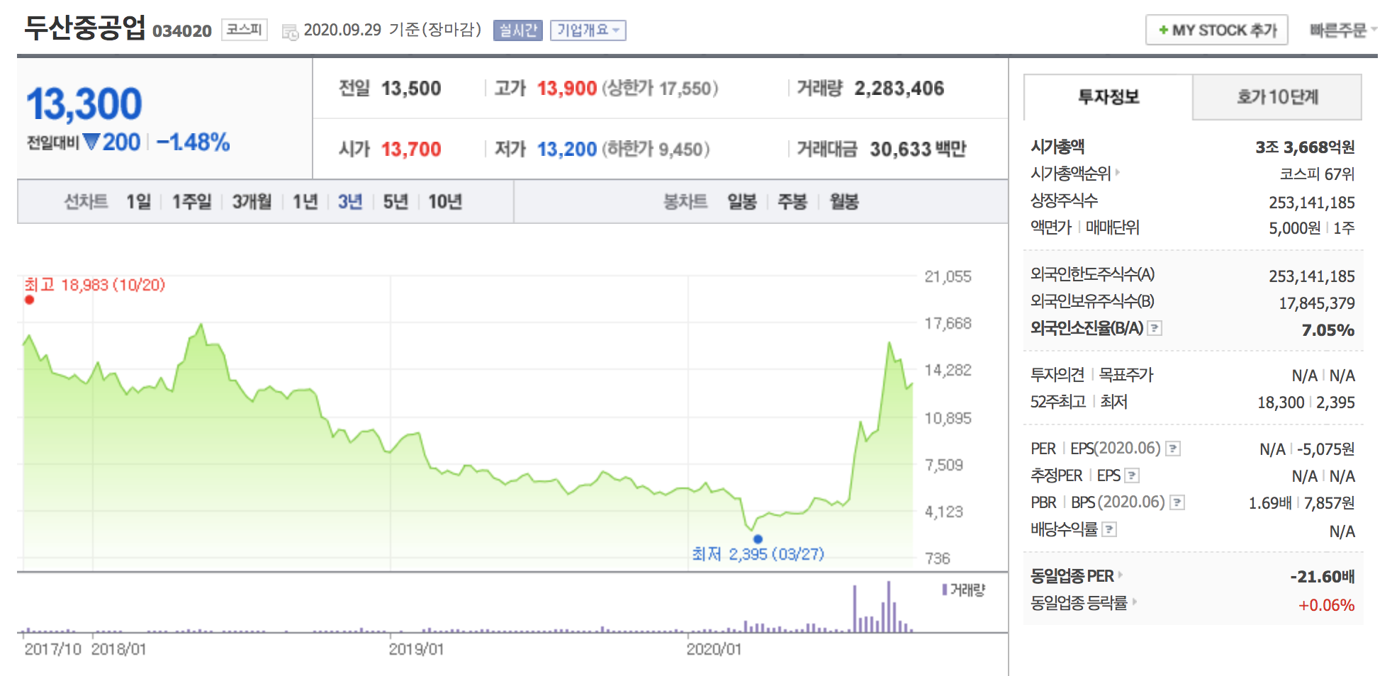 - 두산중공업은 발전설비 및 담수설비, 주단조품, 건설(두산중공업), 건설중장비 및 엔진(두산인프라코어), 토목과 건축공사(두산건설) 등의 사업을 영위하고 있습니다. 재무상태 악화로 인해 3조 자구안으로 두산인프라코어를 매각 중에 있으며 영위하는 사업 역시 친환 경신 사업으로 개편 중에 있습니다.