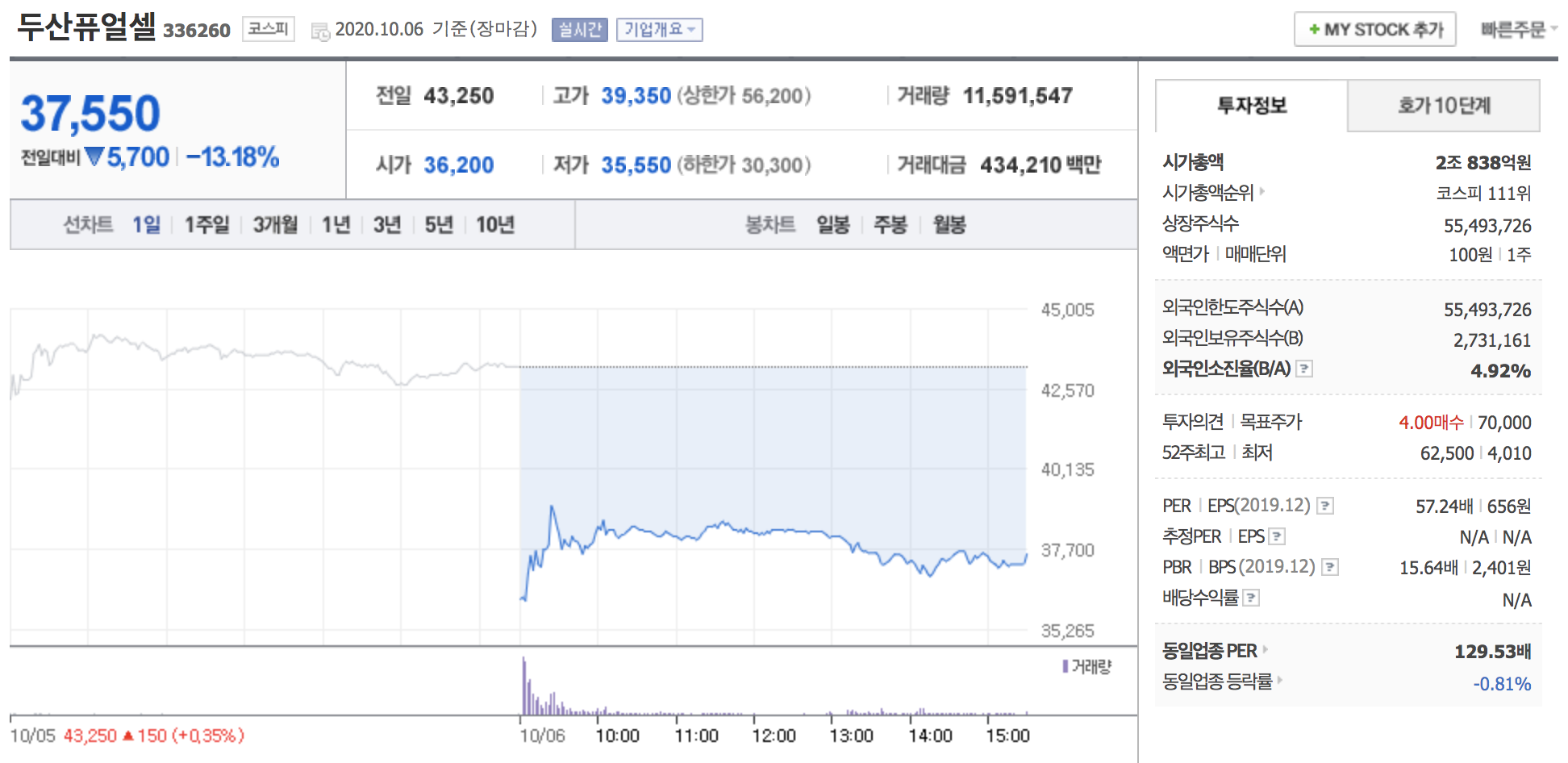2020년 10월 6일 두산퓨얼셀 주가가 20%에 가까운 갭하락으로 시작해 낙폭을 줄이며 13.18% 하락한 37,550원에 장 마감했습니다.