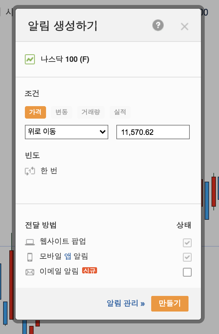 두 번째는 알림 기능입니다. 목표가, 손절가 근처에 알림을 만들어 실시간 선물거래에 도움을 받을 수 있습니다. 지수 변동에 따라 손익이 큰 선물지수 거래인만큼 중요한 기능이라고 볼 수 있습니다. 웹사이트 팝업, 모바일앱 알림 등을 받을 수 있고 최근 이메일 알림도 추가되었습니다.