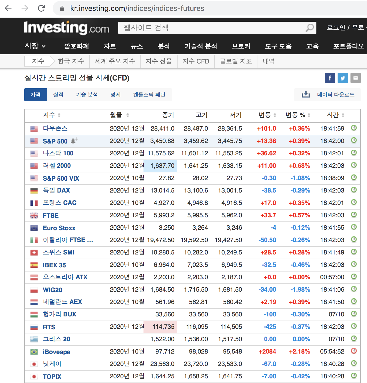 인베스팅 닷컴 상단 좌측 메뉴에서 지수, 지수 선물을 클릭하면 위와 같은 화면이 나옵니다. 전 세계 각국의 선물지수를 실시간으로 확인이 가능합니다.