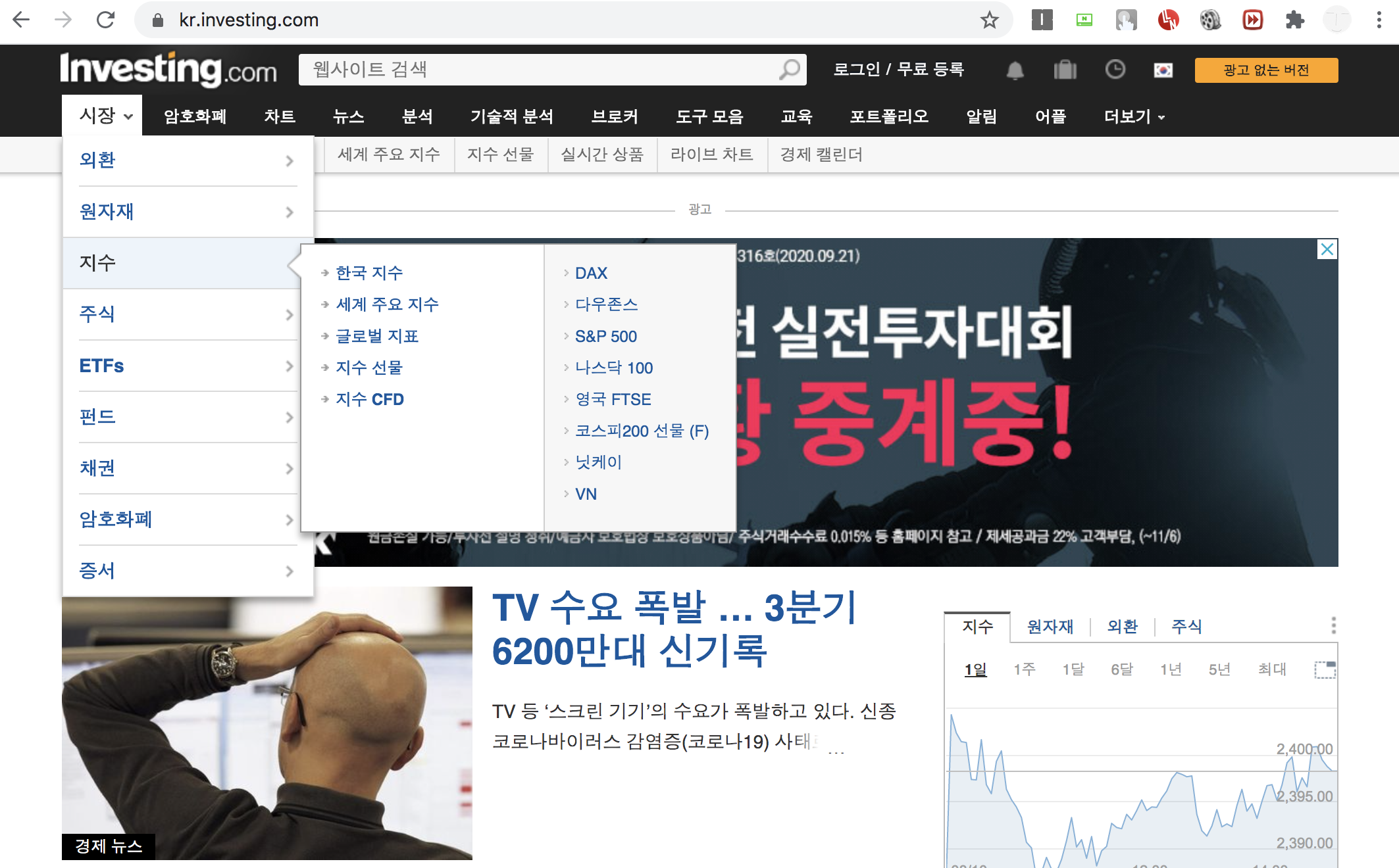 인베스팅 닷컴에서 실시간으로 나스닥 선물지수를 확인하려면 홈페이지 첫 화면 상단 좌측 메뉴에서 지수, 지수 선물을 눌러주면 됩니다.