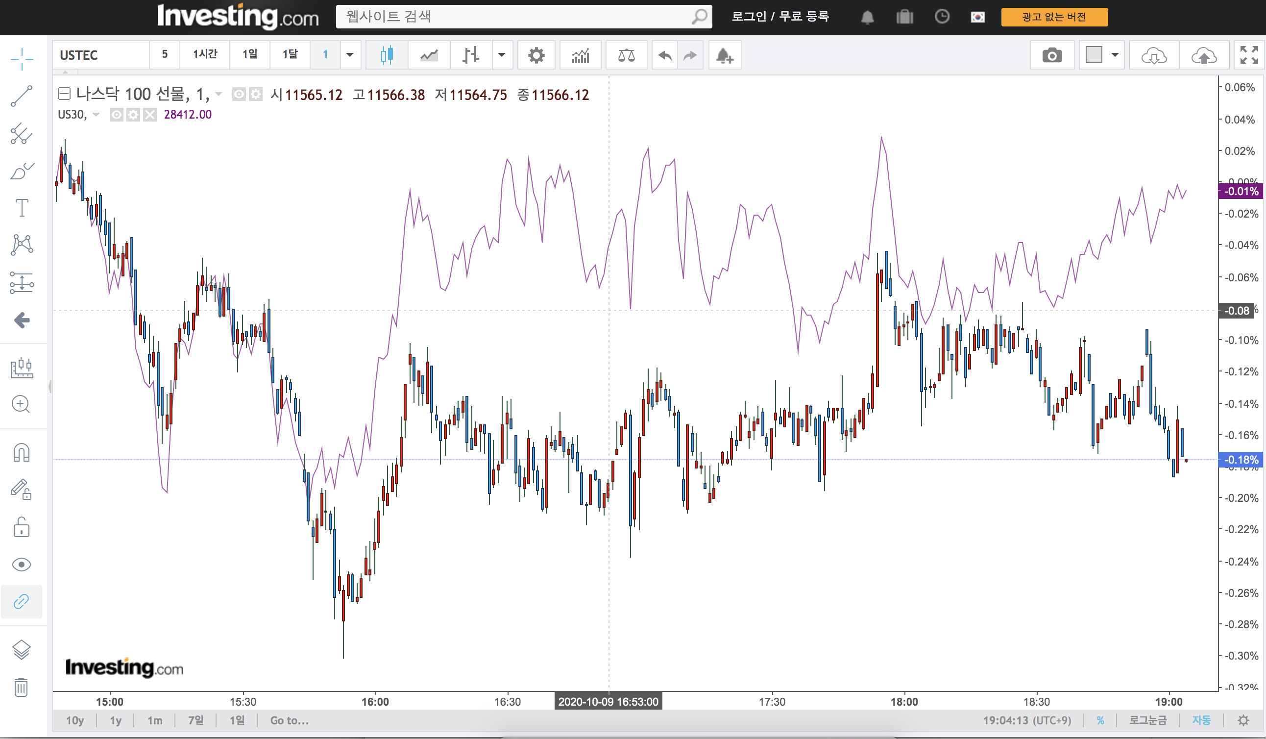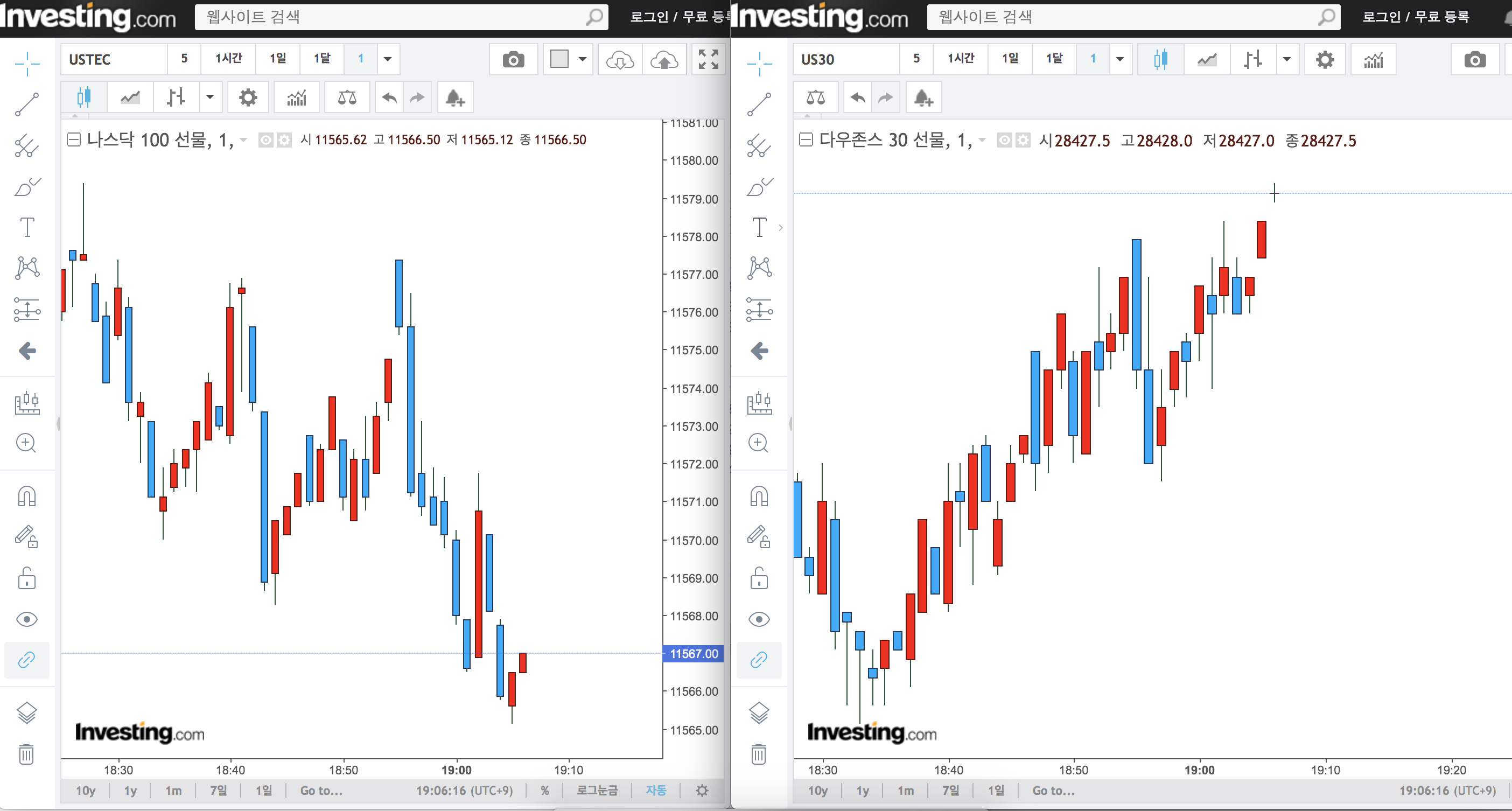 위 화면은 나스닥 100 선물지수와 다우 선물 지수를 비교해본 것입니다. 캔들은 나스닥 100 선물지수이고 그래프는 다우선물 지수입니다. 둘 다 실시간으로 변동을 확인할 수 있고 캔들은 직관적으로 확인이 가능하지만 그래프는 등락은 보이지만 직관적이지는 않습니다.