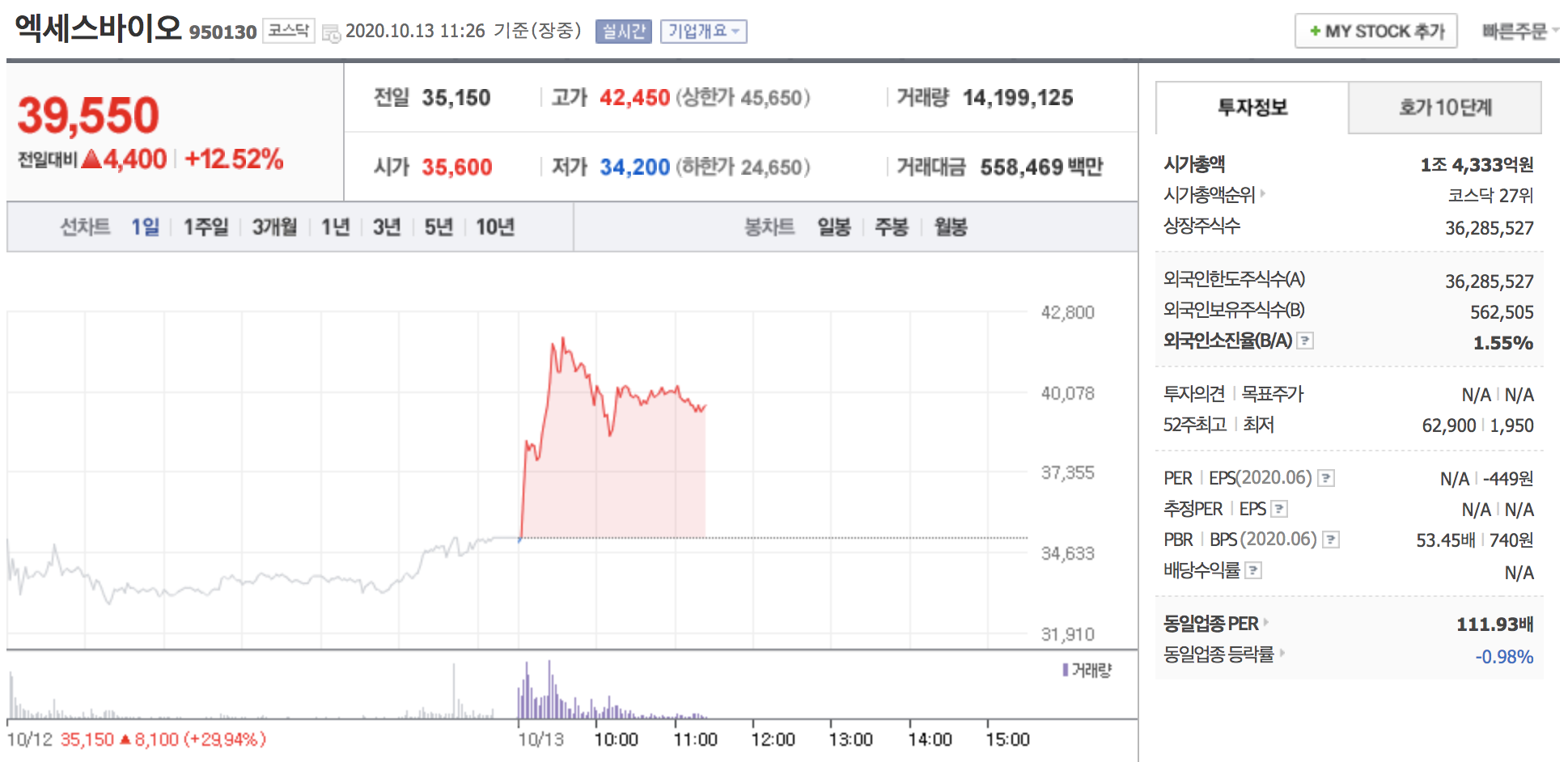 엑세스바이오 주가는 장 초반 25%까지 상승했다가 현재는 상승폭을 줄여 10%대 상승을 보여주고 있습니다. 10월 13일 현재 고가는 42,450원이고 저가는 34,200원입니다.