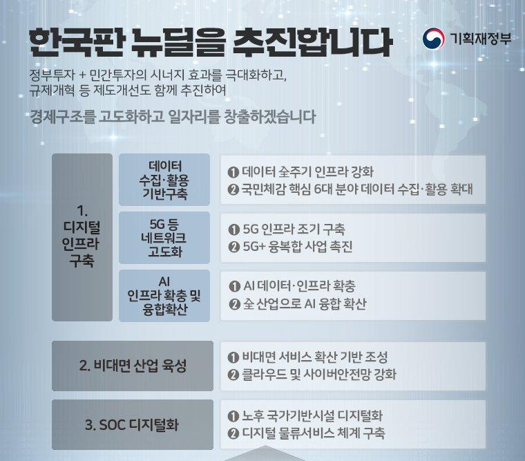 먼저 디지털 뉴딜을 보면 1)D.N.A 생태계 강화 2) 디지털 포용 및 안정망 구축 3) 비대면 산업 육성 4) SOC 디지털화가 주요 과제이며 내용을 들여다보면 빅데이터 플랫폼 구축, 공공데이터 개방, 국가망 5G 전환, 5G·AI 융합, AI·소프트웨어 인재 양성 등이 있습니다 13.4조원을 투입하고 33만 개의 일자리를 창출합니다.