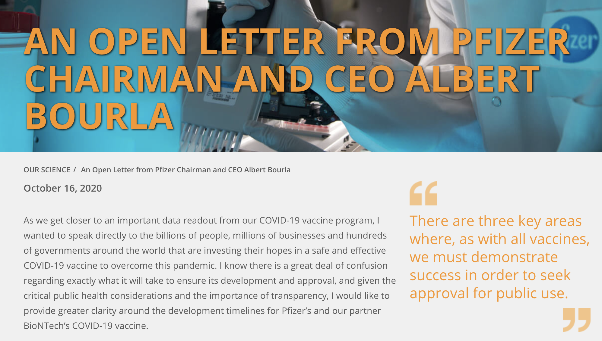 원문 내용을 읽어보면 백신 개발이 다 되었다가 아니라 안정적인 데이터가 도출된다면 11월 셋째 주 긴급사용 승인 신청을 할 것이라는 내용입니다. 물론 인터뷰와 홈페이지 공식적으로 소식을 알린만큼 자신감이 있을 수도 있겠죠.