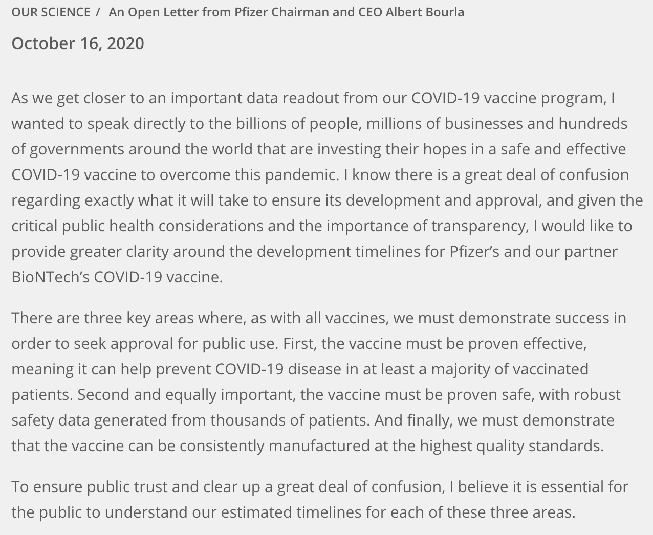 화이자는 회사 홈페이지에 코로나 19 백신 관련 글을 올렸습니다. "화이자는 안전성 검증 자료를 확보하는 시점인 11월 셋째 주에 FDA에 긴급사용 승인을 신청할 것으로 기대된다."라고 밝혔습니다.