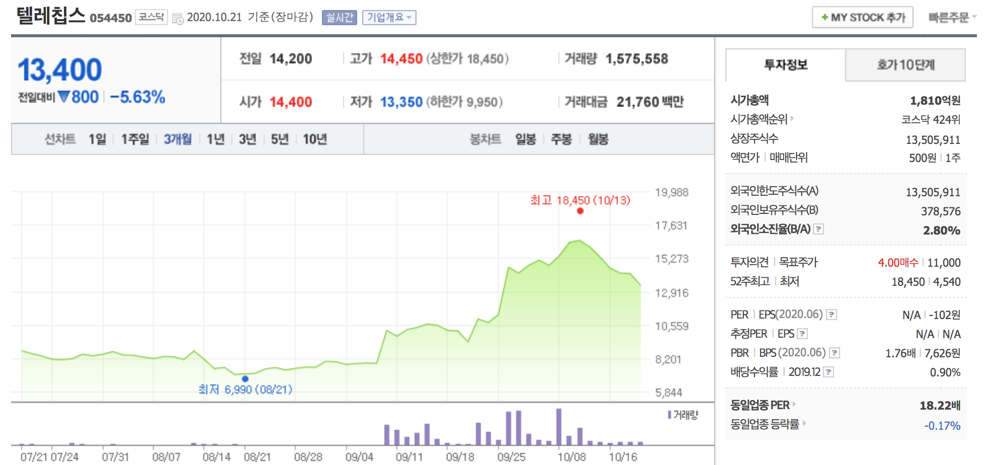 - 텔레칩스 역시 자율주행 관련주들과 마찬가지로 배터리데이 전후로 강한 상승을 한 후 하락 중입니다.