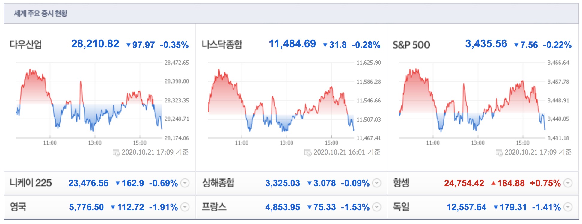 2020년 10월 21일(현지시간) 미증시 장마감 상황