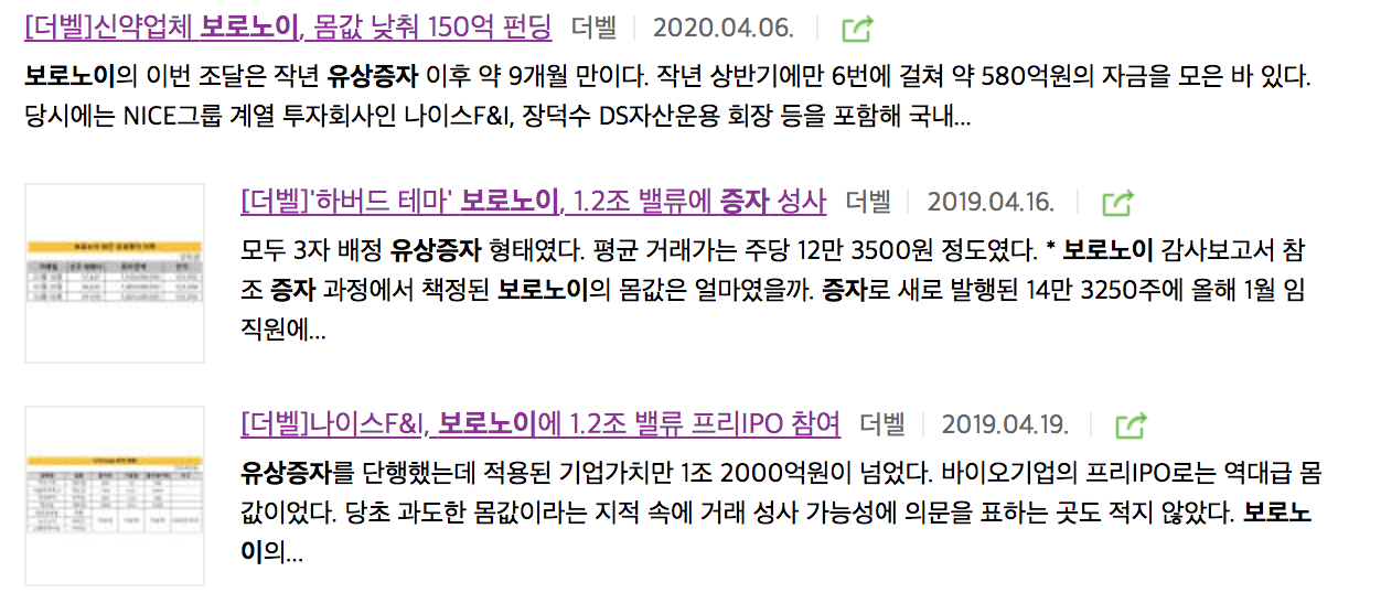 2019년 보로노이의 기업가치는 1조로 평가 되었고 장외에서는 2조 시총으로 거래가 되고 있었습니다. 올해는 약 5,000조 정도의 벨류로 유상증자를 진행하기도 했습니다. 제약, 바이오 열풍이 불고 있는 대한민국에서 다시 IPO를 진행한다면 어떤 결과를 맞이할지 기대가 됩니다.