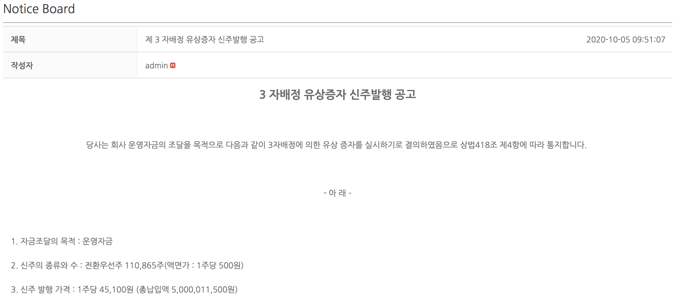 올해 운영자금 조달을 위해 2월 30일 332,594주 그리고 10월 5일 118,650주 전환우선주(CPS)를 신규 발행했습니다. 주당 발행 가격은 45,100원으로 총납입액은 약 200억 원이었습니다. 3자 배정 유상증자 형태로 이루어졌는데 구체적인 투자업체는 알려지지 않았습니다.