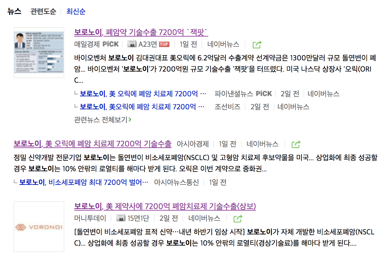 보로노이는 이번 기술 수출 계약 이전에도 하버드대학교 산하 다나파버 암센터와 파킨슨병 치료 후보물질을 기술 이전 계약(약 490억 원 규모)을 맺었으며, 당시 다나파버가 보로노이에 지분투자도 함께하여 큰 주목을 받기도 했습니다.