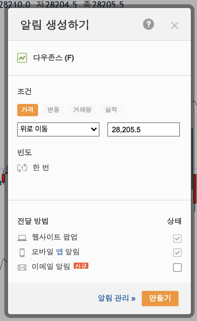 목표가, 손절가 근처에 알림을 몇 개 만들어 실시간 선물거래에 활용할 수 있습니다. 현재는 웹사이트 팝업, 모바일앱 알림 등을 받을 수 있고 최근 이메일 알림도 추가되었습니다.