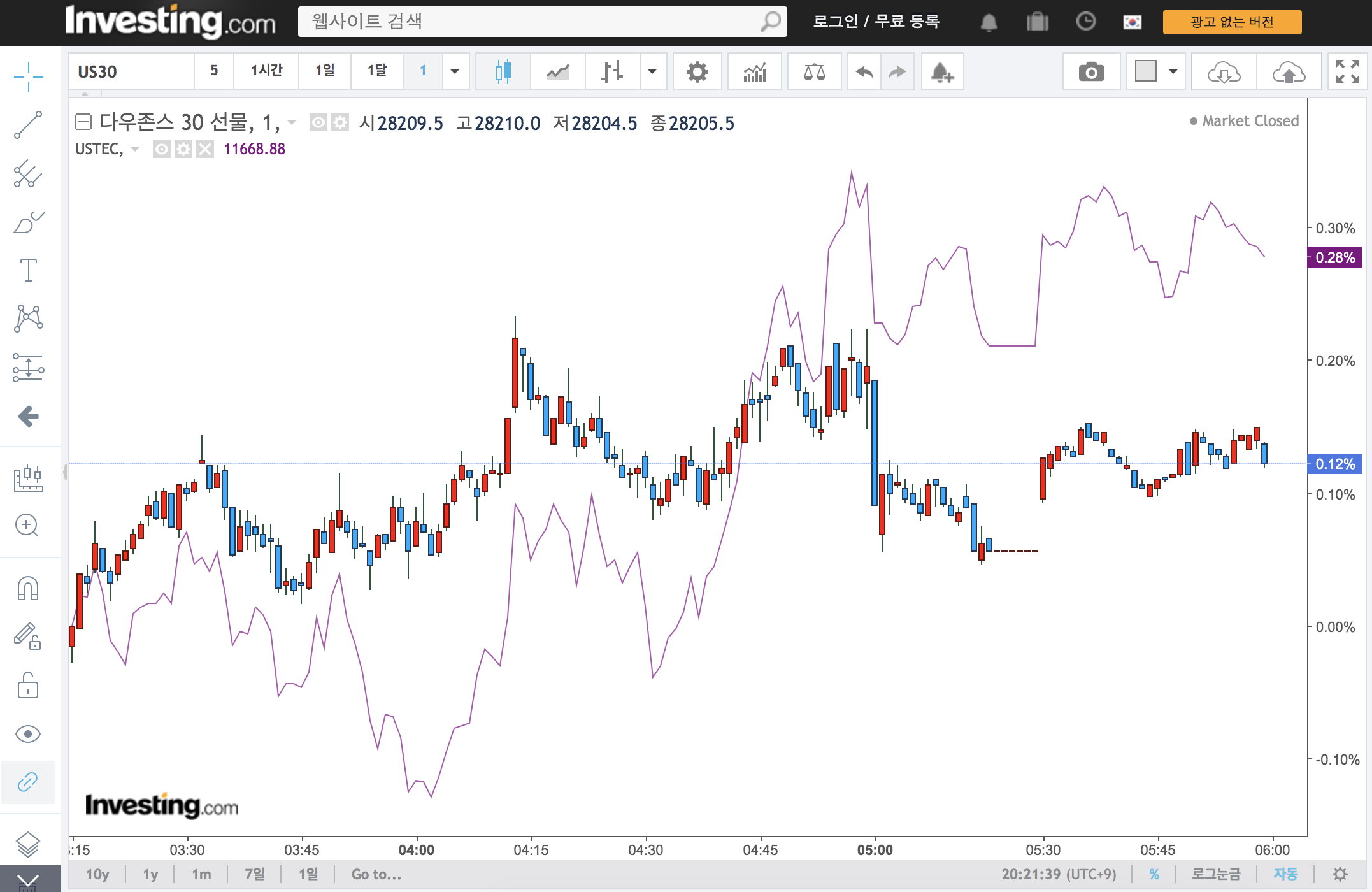 캔들은 다우 선물지수이고 그래프는 나스닥 선물 지수입니다. 둘 다 실시간으로 변동을 확인할 수 있고 캔들은 위아래 수직으로 움직여 직관적으로 확인이 가능하나 그래프의 경우 대각선으로 움직여 보기가 살짝 힘듭니다.