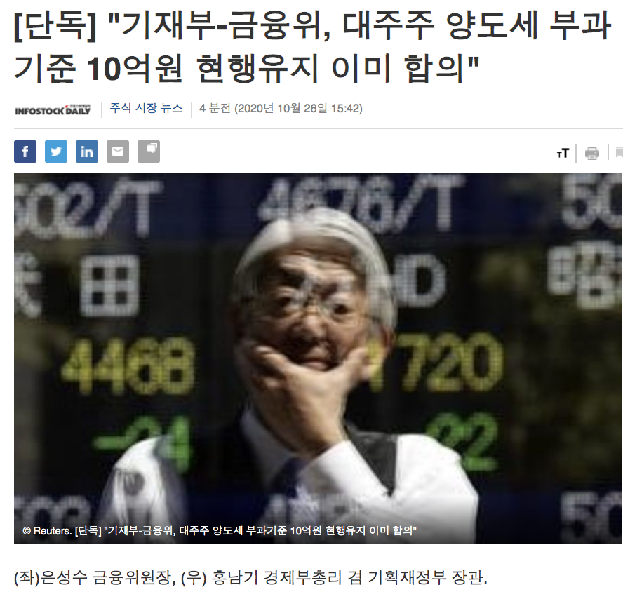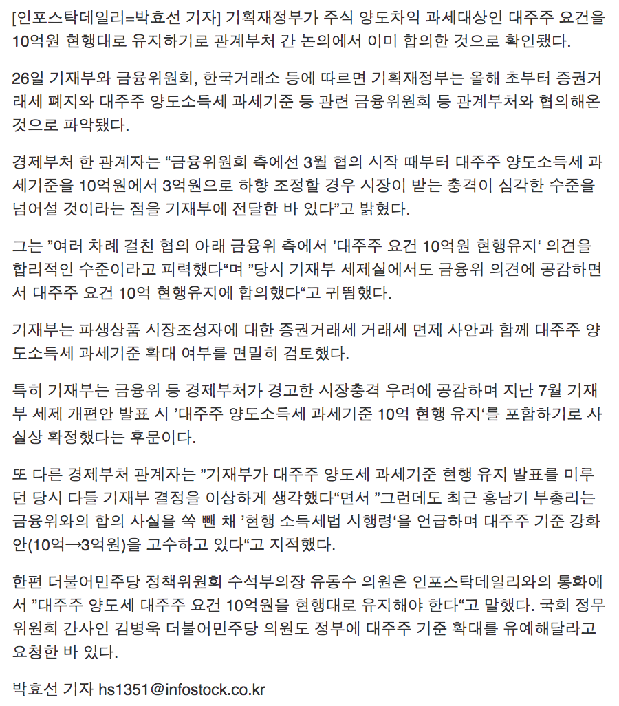 엥??? 진짜 엄청난 기사가 하나 나왔습니다. <대주주 양도세 부과 기준 10억원 현행유지 이미 합의> 라는 타이틀의 기사입니다.
