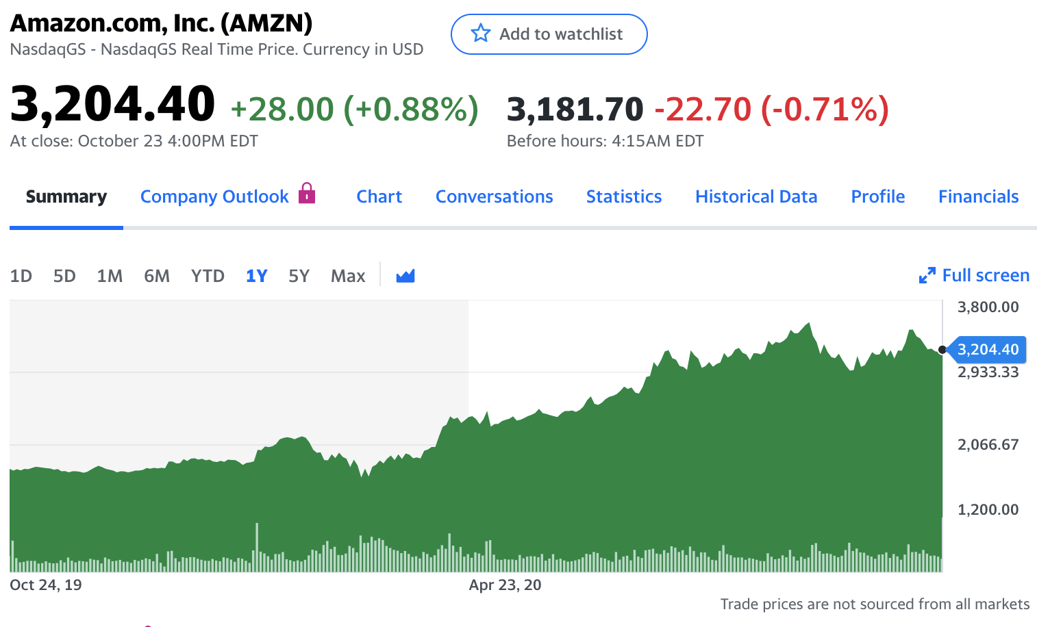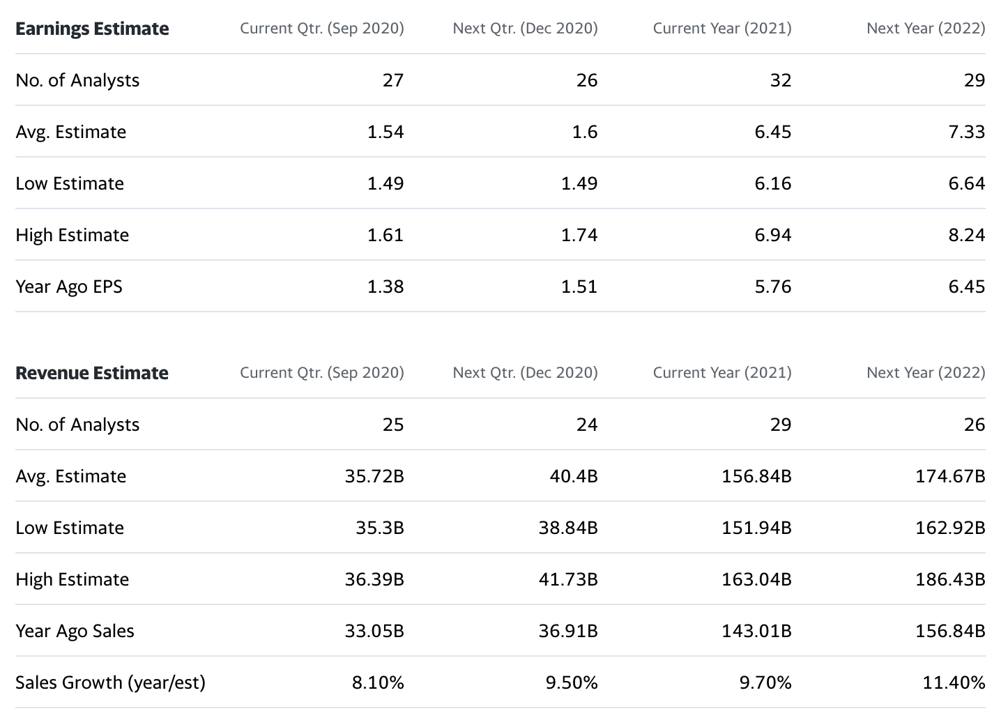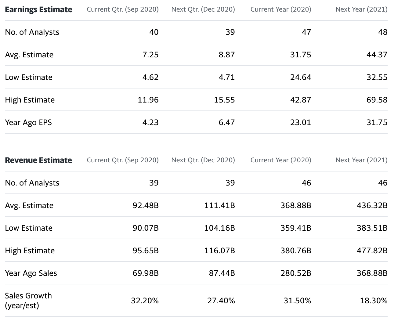 - 아마존은 지난 2분기 어닝서프라이즈를 기록했는데, 3분기 역시 강한 매출성장이 예상되고 있습니다. 2분기와 마찬가지로 코로나 19로 인한 이커머스 시장 확대가 실적 상승의 주요 포인트입니다. 최근에 열린 프라임데이가 성공적으로 끝나면서 4분기 실적 예상까지 좋아지는 상황입니다.