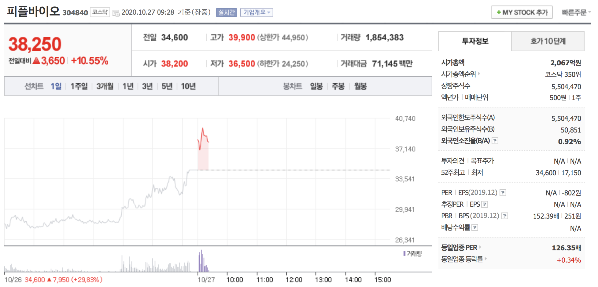 피플바이오 주가가 개장 직후 급등하며 10%대 상승에 도달했습니다.