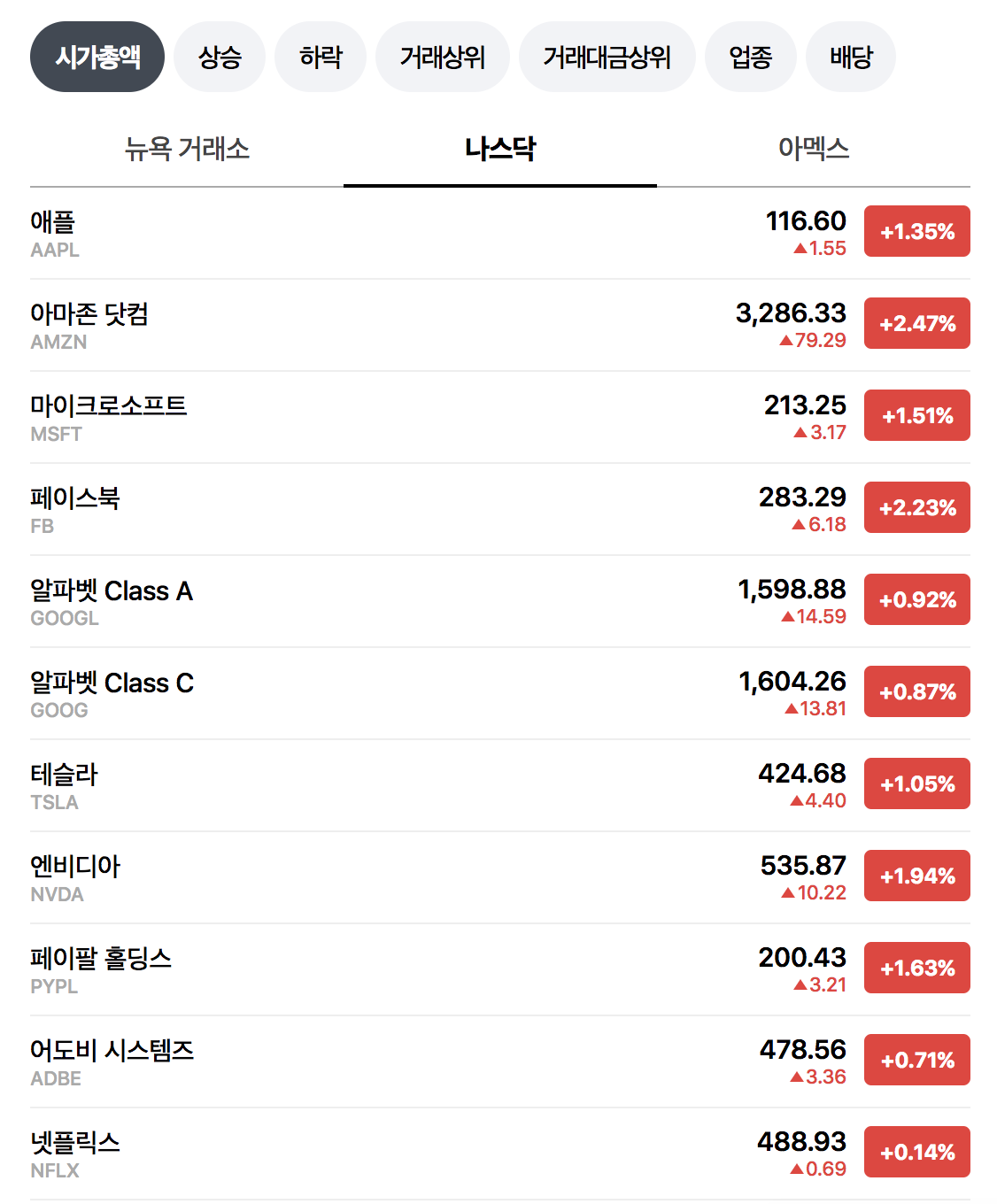 - 구글 주가 : 알파벳 A는 +0.92% 를 기록하며 1,598.88달러, 알파벳 C는 +0.87%를 기록하며 1,604.26 달러로 장마감.