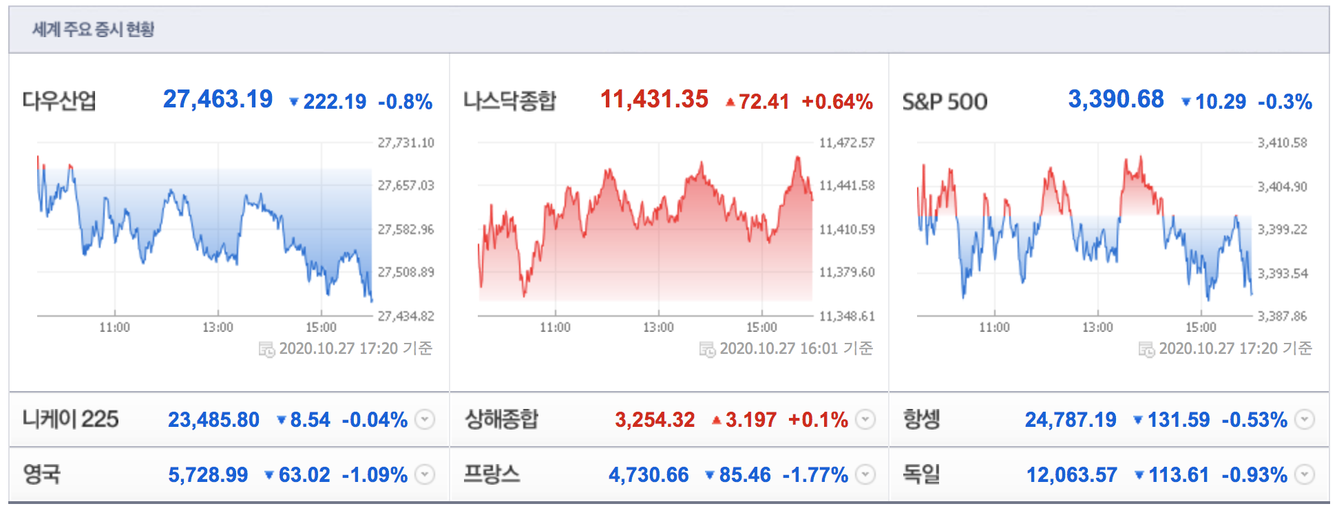 2020년 10월 27일(현지시간) 미증시 장마감 상황