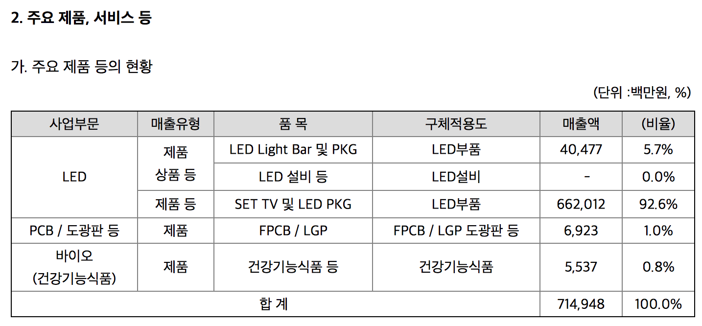 이름부터 제약, 바이오 기업으로 보이는 우리바이오의 매출 대부분은 LED가 차지하고 있습니다. 6월 반기 보고서를 살펴보면 LED부품이 매출의 92.6^를 차지하는 것을 확인할 수 있습니다.