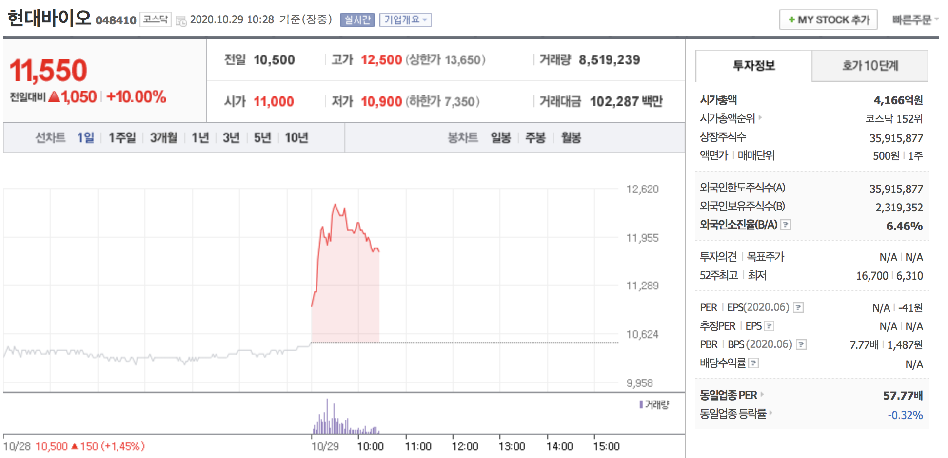[오늘 급등주] 현대바이오 10%대 급등 도달 10월 29일