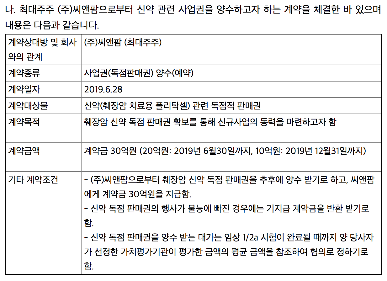 씨앤팜으로부터 췌장암 신약 관련 사업권을 양수하고자 하는 계약을 체결해 독점 판매권을 획득하기도 했으며 효과적인 췌장암 신약 개발에 성공한다면 비약적인 발전을 이어나갈 것으로 전망됩니다.