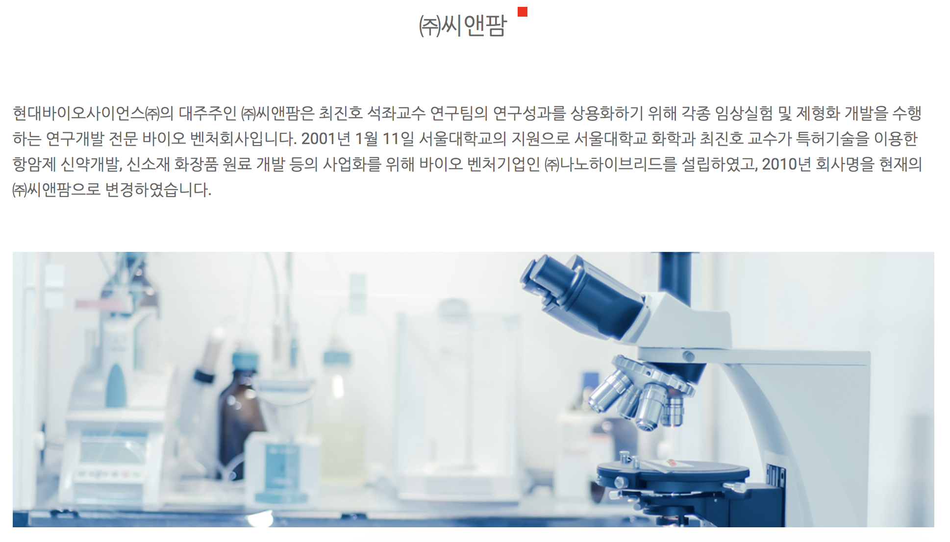 또한 씨앤팜과 공동으로 백내장 수술 후 염증치료용 점안제 개량신약 개발, 췌장암 치료 신약 임상 준비 등을 통하여 바이오 화장품 사업에서 벗어나 제약 분야로 사업영역을 확대하고 있습니다.