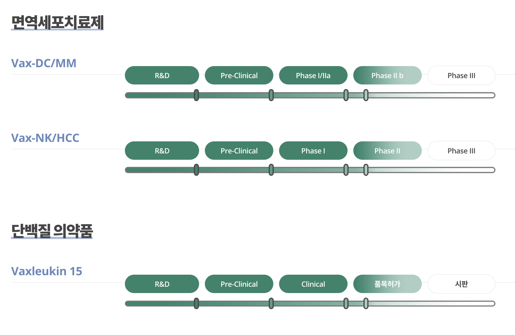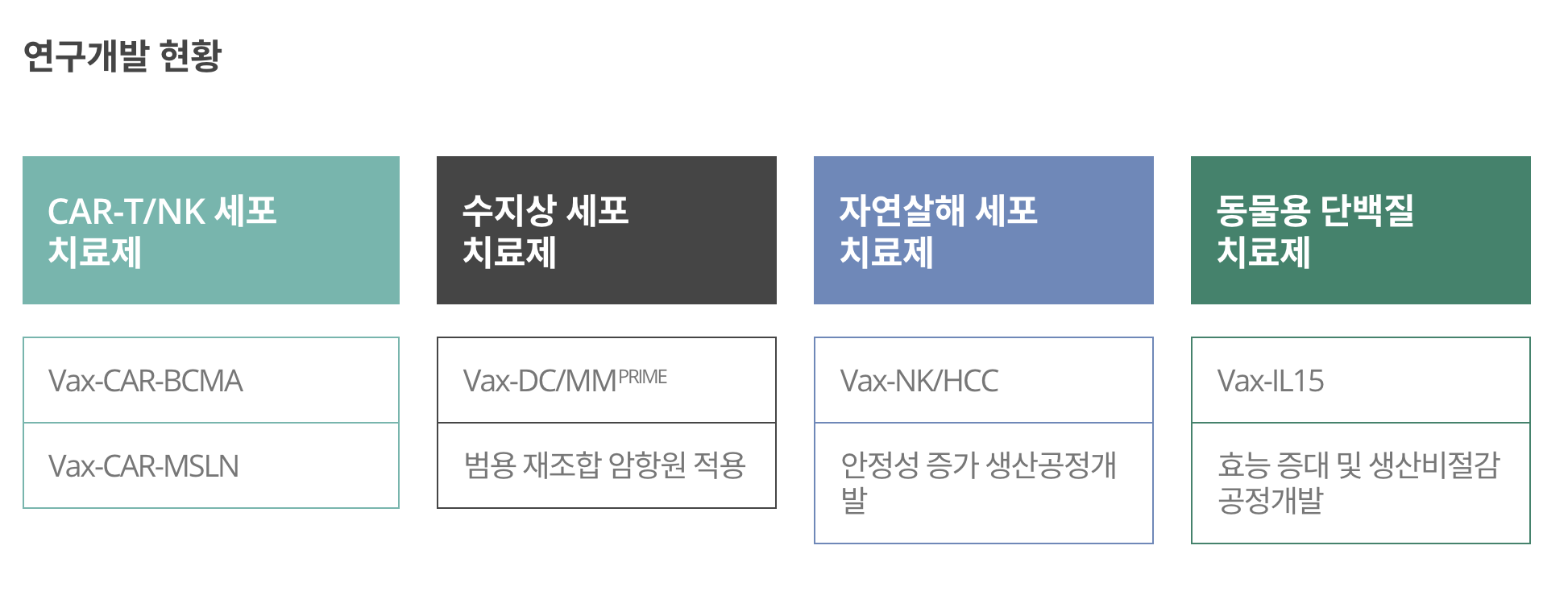 Vax-NK 항암면역치료 플랫폼, Vax-DC 항암면역치료 플랫폼, 차세대 첨단 CAR-T 치료제인 Vax-CAR 항암면역치료제 플랫폼을 보유하고 있으며 동물용 항암면역치료제인 박스루킨-15까지, 항암면역 전반을 아우르는 제품군을 연구 개발한 이력이 있습니다.