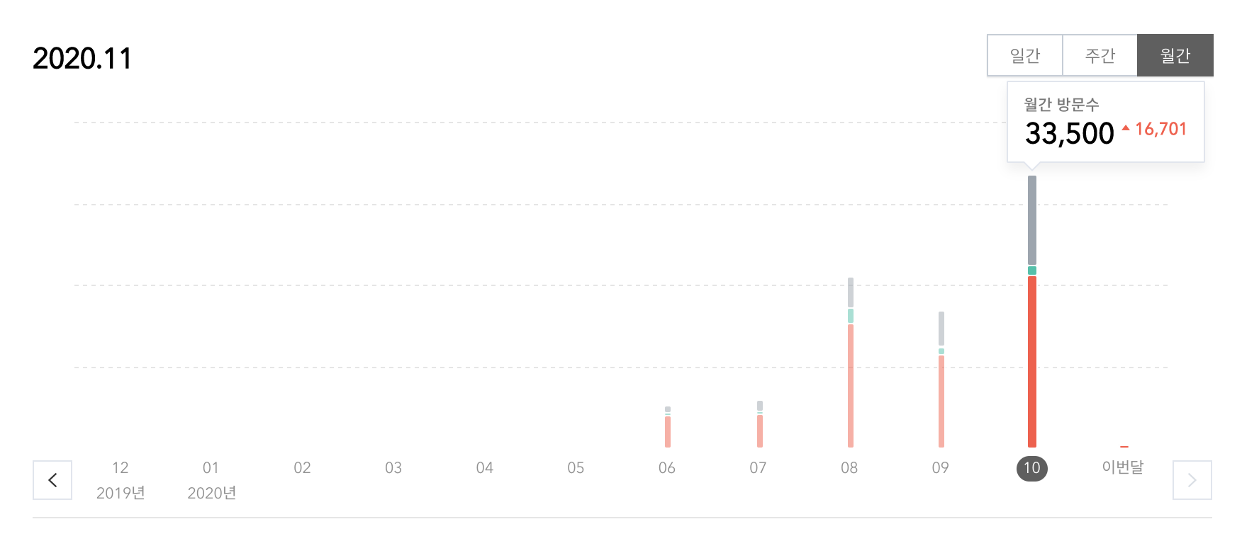 티스토리 통계에서 보면 10월 총 방문수(페이지 조회수)는 33,500회를 달성했습니다. 애드센스와 약간 차이가 있습니다.