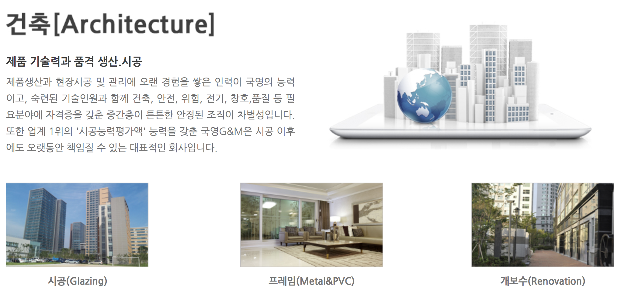 국영지앤엠은 유리 가공업체로 원자재인 판유리를 판유리 생산업체로부터 구매하여 용도에 맞게 가공하여 직판 또는 상업용, 주택용 건물 프로젝트 수주계약을 하여 시공하고 있습니다.