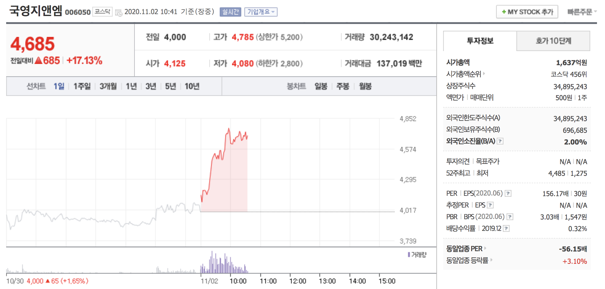10시 41분 현재는 상승폭을 조금 줄여 17.13% 상승한 4,685원에 거래되고 있습니다.