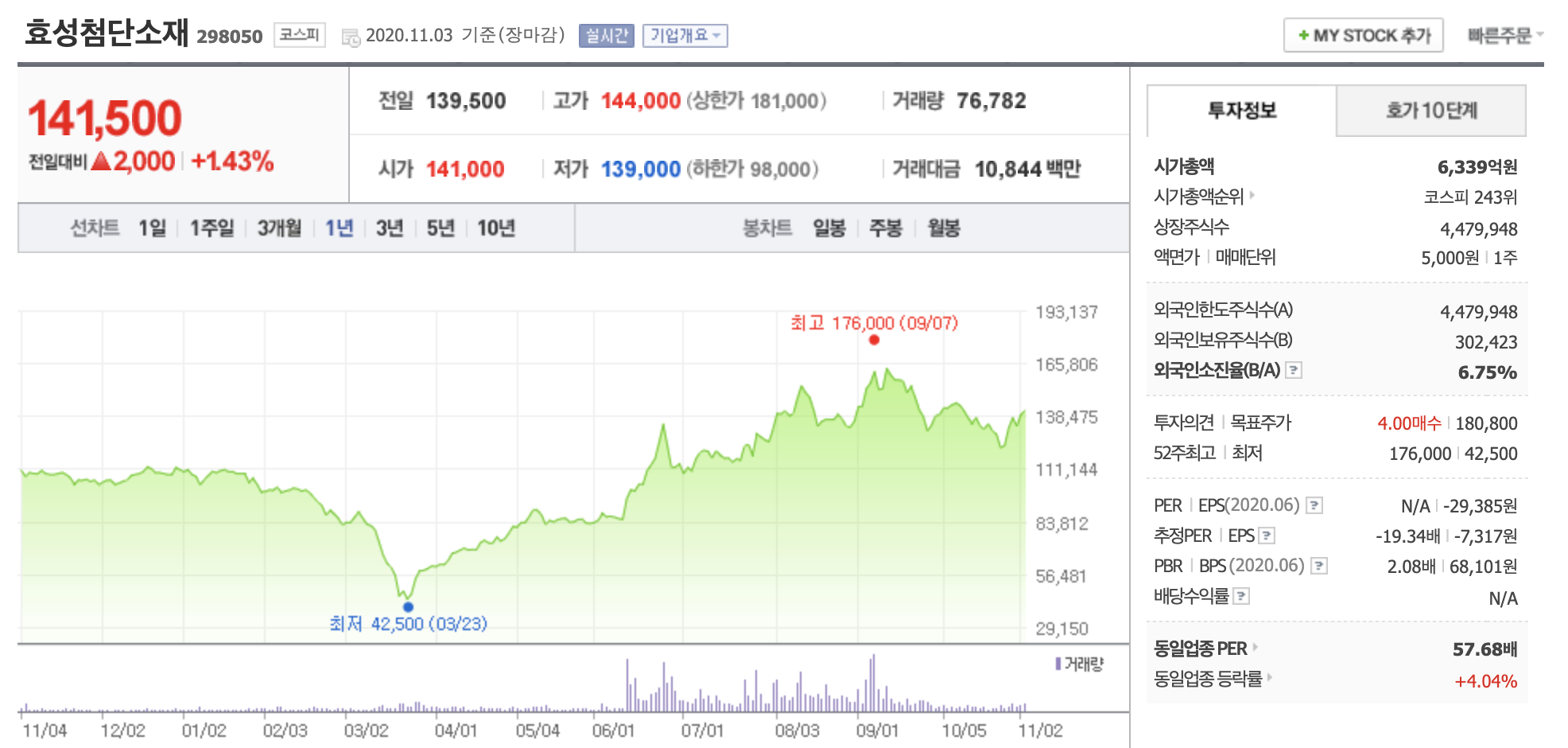 급락 당시 주가는 최저점 42,500원을 찍고 수소차 모멘텀으로 9월 7일 최고가 176,000원을 찍고 최근 조정을 받은 후 반등을 모색하고 있는 모습입니다.