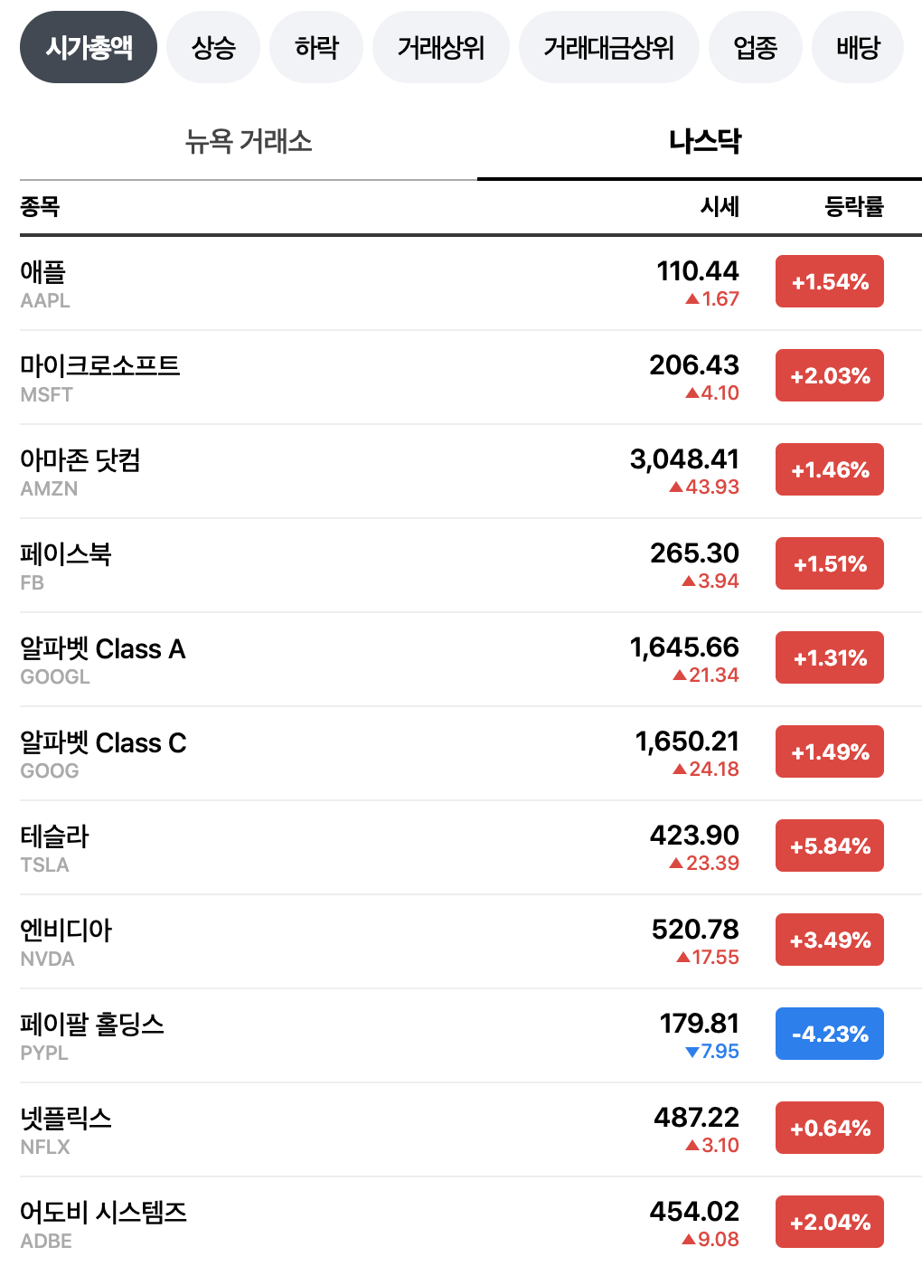 - 구글 주가 : 알파벳 A는 +1.31%를 기록하며 1,645.66 달러, 알파벳 C는 +1.49%를 기록하며 1,650.21 달러로 장마감.