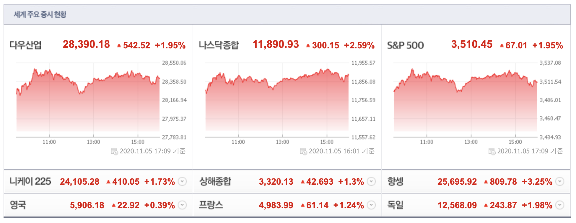 2020년 11월 5일(현지시간) 미증시 장마감 상황